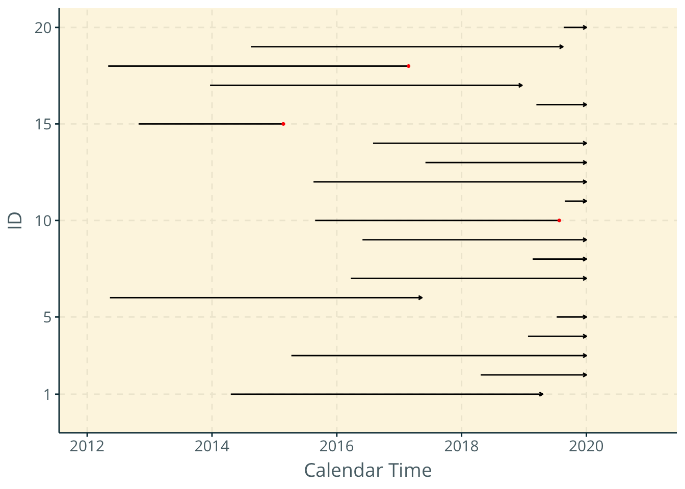 geom_segment(data = dat %>% filter(y==0), aes(x = year0, y = id, xend = year0+t, yend = id), arrow = arrow(length = unit(0.1, "cm"))) +