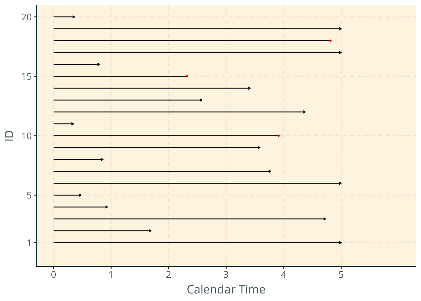 geom_segment(data = dat %>% filter(y==0), aes(x = 0, y = id, xend = t, yend = id), arrow = arrow(length = unit(0.1, "cm"))) +