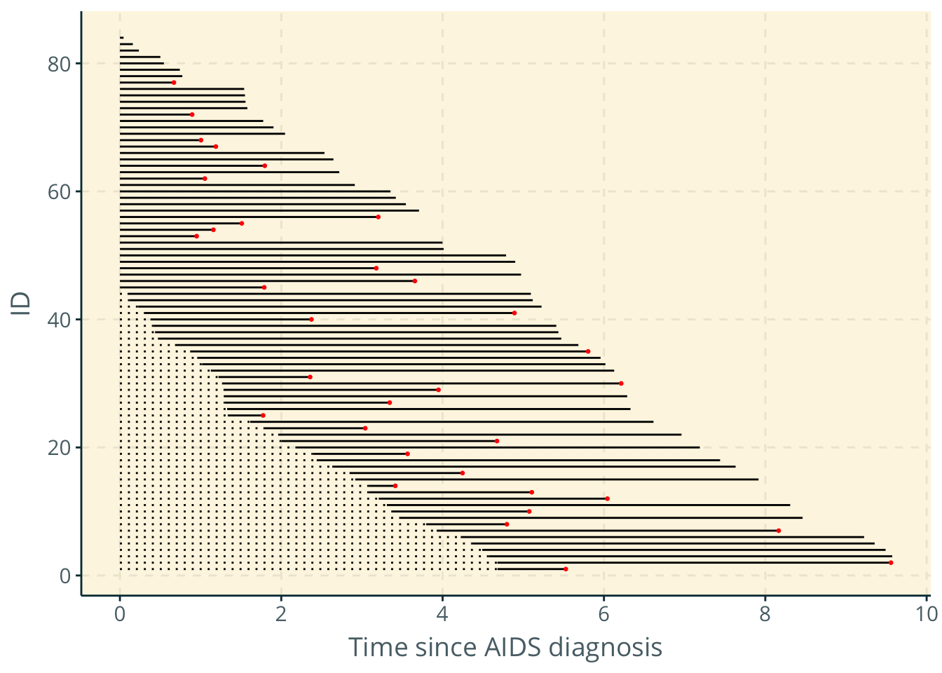 geom_point(data = exdat2, aes(x = t, y = newid), color = "red", size = 0.5) +