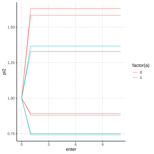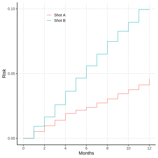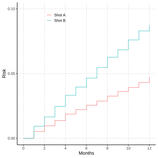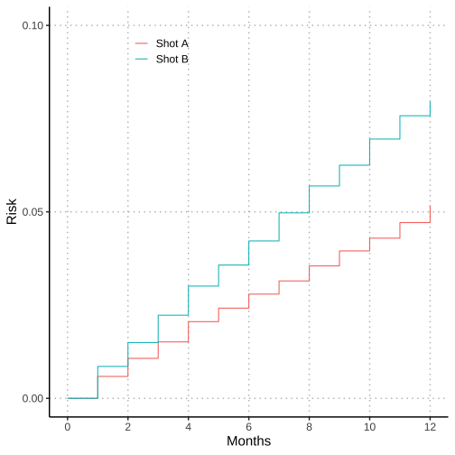 --- <style> .center2 { margin: 0; position: absolute; top: 25%; } .center3 { margin: 0; position: absolute; top: 30%; } </style> # Where are we? **Reading:** Lu H, Cole SR, Westreich D, Hudgens MG, Adimora AA, Althoff KN, Silverberg MJ, Buchacz K, Li J, Edwards JK, Rebeiro PF. Clinical Effectiveness of Integrase Strand Transfer Inhibitor–Based Antiretroviral Regimens Among Adults With Human Immunodeficiency Virus: A Collaboration of Cohort Studies in the United States and Canada. Clinical Infectious Diseases. 2020 Aug 11. **Today:** Introduction to (simple) time varying exposures **Thursday:** Exercise and discussion --- # Why do exposures vary over time? Interventions are often static: - Ban chemical X - Treat condition Y using drug Z for the duration of illness But when estimating the effects of these (often hypothetical) interventions using observational data, we often see that exposure varies over time. For example: - Exposure to chemical X changes when people move or get a new job - People discontinue drug Z due to side effects --- # DAGs for time-varying exposures <br><br><br><br> .center[ <img src="img/10/dag1.png" width="40%" /> ] --- # DAGs for time-varying exposures <br><br><br><br> .center[ <img src="img/10/dag2.png" width="40%" /> ] --- # A simple scenario This week, we will begin to think about time varying exposures in a simple setting: > You are studying a possible treatment for disease X, which currently has no available treatments. > You perform a trial in which you recruit people with disease X and randomize them to no treatment or treatment with Drug A for the duration of illness. >Some people who you randomize to Drug A discontinue treatment during the year. >You want to compare the probability of recovery by 1 year. > Assume no loss to follow-up and no deaths or other competing events occured during the course of the study. --- # Example DAG .center[ <img src="img/10/exdag1.png" width="40%" /> ] --- # Choosing a parameter What do we want to estimate? **Choices** The <span style="color:red">"intent-to-treat" </span> parameter: What would the probability of recovery have been if I had assigned everyone to take drug A vs if I had assigned everyone to no treatment? - We estimate risk in the treatment arm without regard to treatment discontinuation -- The <span style="color:red">"per protocol" </span> parameter: What would the probability of recovery have been if I had assigned everyone to take drug A and they had taken it throughout follow-up vs if I had assigned everyone to no treatment? - We perform a second "intervention" to prevent treatment discontinuation -- .footnote[[*] "Intent-to-treat" and "per protocol" are just words. Do not expect everyone who uses these words to refer to the same parameters. If the parameter of interest is unclear, ask!] --- # Example DAG, revisited .center[ <img src="img/10/exdag1.png" width="40%" /> ] --- # Statistical analyses We will discuss how to conduct analyses to estimate the "intent-to-treat" and "per protocol" parameters. 1. How are the data organized? 2. What estimators are used? --- # Example data records <img src="img/10/t1.png" width="40%" /> --- # "Intent-to-treat" analysis ## Data set-up .pull-left[ <img src="img/10/t1.png" width="60%" /> ] .pull-right[ <img src="img/10/lines1.png" width="100%" /> ] --- # "Intent-to-treat" analysis ## Data set-up .pull-left[ <img src="img/10/t1.png" width="60%" /> ] .pull-right[ <img src="img/10/lines2.png" width="100%" /> ] --- # "Intent-to-treat" analysis .pull-left[ <img src="img/10/t1.png" width="70%" /> ] .pull-right[ **Arm 1: No treatment**. Kaplan-Meier estimator of the risk of recovery, limited to the no treatment arm <br> <br> **Arm 2: Assign Drug A**. Kaplan-Meier estimator of the risk of recovery, limited to those assigned drug A ] -- Or, estimate HR using `$$h^{itt}(t) = h_0(t)\exp(\beta A_0)$$` --- # "Intent-to-treat" analysis Why can we use crude comparisons of unweighted risk functions in this example? --- # "Per protocol" analysis Challenge: We want to know what would have happened had everyone in the treatment arm remained on treatment throughout follow-up, **but some participants discontinued treatment**. <br><br> Solution: Censor people when they stop following the "protocol" (i.e., at treatment discontinuation). <br><br> Account for this _informative censoring_ using IPW. --- ## Recall, DAG .center[ <img src="img/10/exdag1.png" width="40%" /> ] --- # Data setup **Step 1**: Reorganize data to capture time-updated covariates, if necessary <img src="img/10/expand.png" width="70%" /> --- # Data setup **Step 2**: Censor at treatment discontinuation <img src="img/10/censor.png" width="70%" /> --- # "Per protocol" analysis with IPW **Step 3**: Use IPW to account for informative censoring induced in the previous step. -- **Arm 1: No treatment**. Limit dataset to those randomized to no treatment. No discontinuation, so everyone has a weight of 1 for entire period. **Arm 2: Continuous treatment**. Limit dataset to those randomized to treatment, censor at treatment discontinuation, and apply IPCW. -- Let `\(T_D\)` represent the time of treatment Discontinuation. `$$\pi_D=\frac{P(T_D>t|A_0)}{P(T_D>t|Z_t, A_0)}$$` -- Let `\(D(t)\)` be an indicator of treatment discontinuation at time `\(t\)` `$$\pi_D= \prod_{out=1}^{\lceil t \rceil }\frac{1-P(D_{out}=1|D_{in}=0, A_0)}{1-P(D_{out}=1|\bar{D}_{in}=0, Z_{in}, A_0)}$$` -- We can estimate `\(P(D_{out}=1|D_{in}=0, Z_{in{}}, A_0)\)` using pooled logistic regression. --- # "Per protocol" analysis with IPW **Step 3**: Use IPW to account for informative censoring induced in the previous step. **Arm 1: No treatment**. Limit dataset to those randomized to no treatment. No discontinuation, so everyone has a weight of 1 for entire period. **Arm 2: Continuous treatment**. Limit dataset to those randomized to treatment, censor at treatment discontinuation, and apply IPCW. <img src="img/10/pi.png" width="70%" /> --- # "Per protocol" analysis with IP